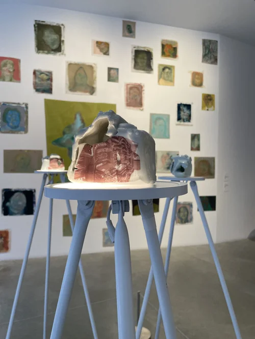 Ahrens work develops an embodied practice in which they are queering craft through slip-casting as a form of feminine reproduction. The series, Mining the Viral (2020) investigates the slippage of digital memory through acts of squashing. The camera forms investigate themes of arresting decay and the desire to see oneself in material. The work, A New Lens, pulls inspiration from EMDR (eye movement desensitization and reprocessing) therapy to discuss the likeness of failure in both the body and in art practice, in a reparative effort to celebrate the vibrancy of life.